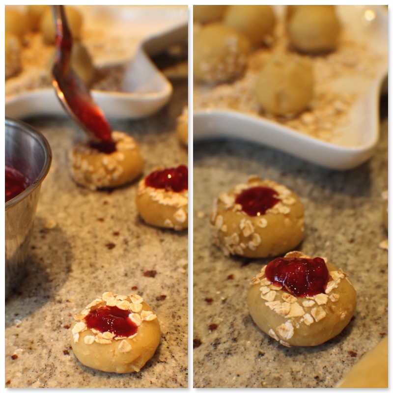 Rúllið deiginu upp í tvær pulsur. Skerið í jafna bita og gerið kúlur úr hverjum bita. Veltið upp út haframjöli og myndið litla holu í hverja kúlu.