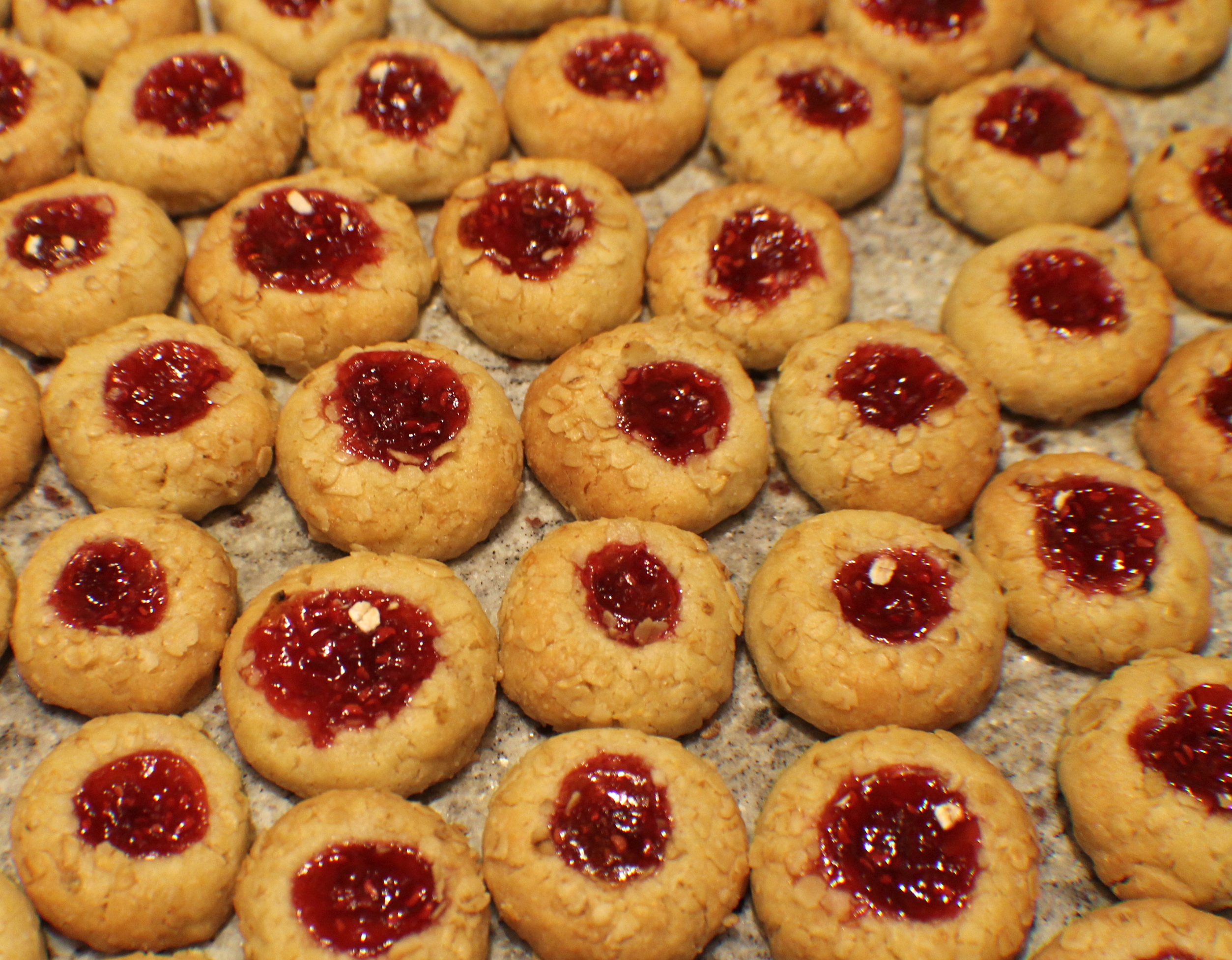 Setjið hindberjasultu á hverja köku. Raðið á bökunarplötu og bakið við 180°C í 10 – 12 mínútur.