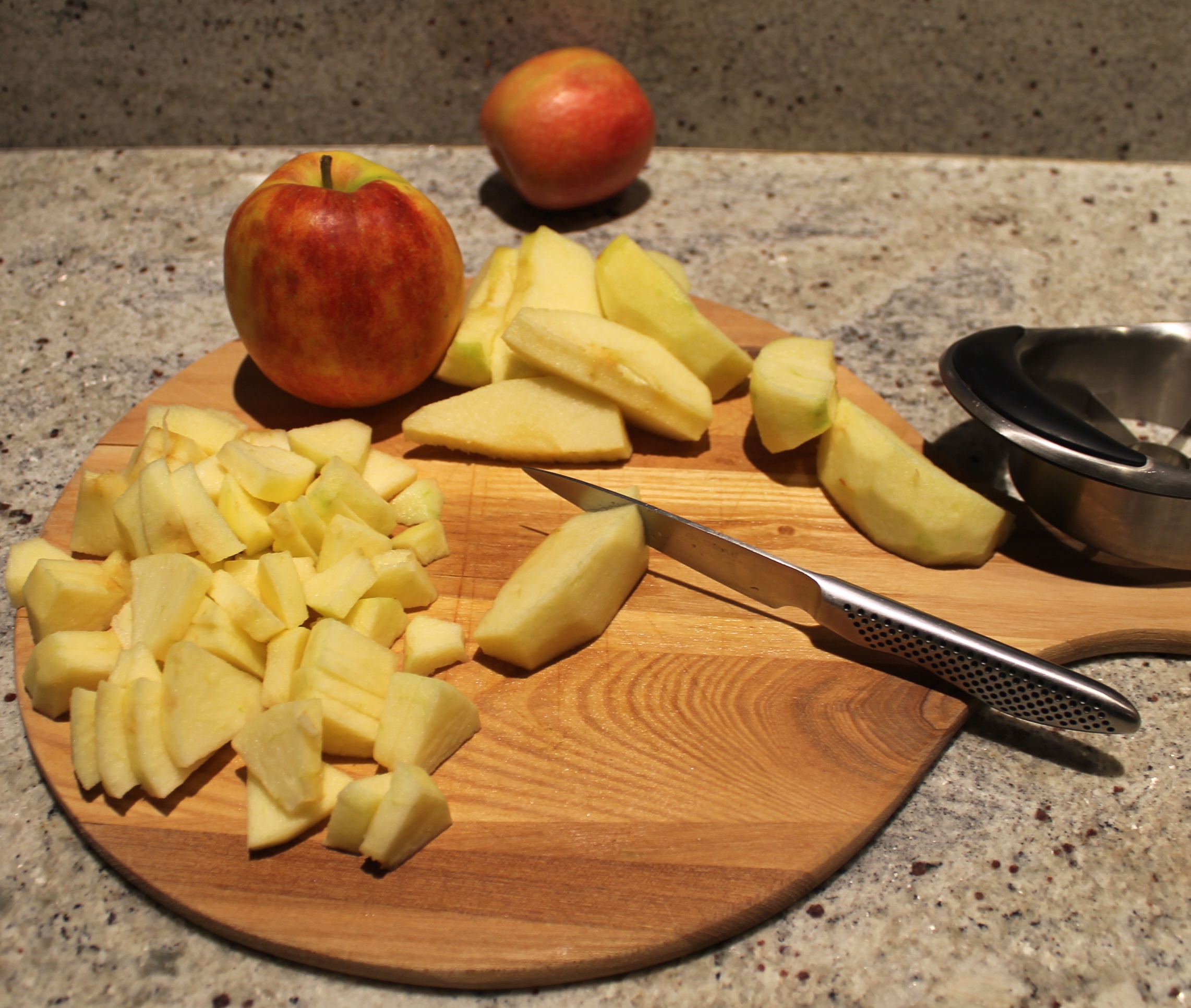 Afhýðið eplin og skerið í teninga. Setjið eplabitana í skál og blandið kanil, sykri og sítrónusafa saman við eplin.