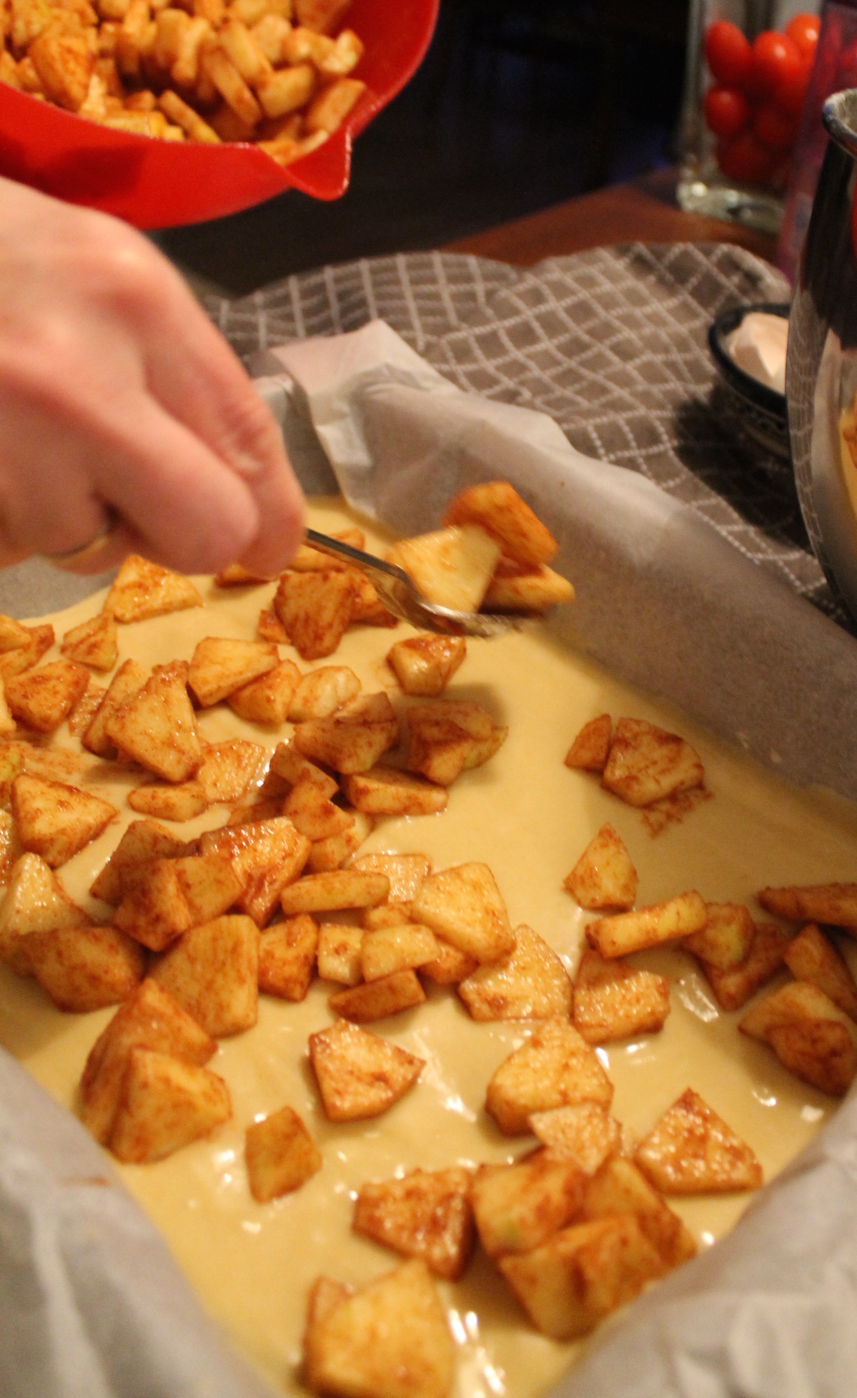 Setjið helminginn af deiginu í botninn á vel smurðu eða pappírsklæddu skúffukökuformi sem er um það bil 33×25 cm. að stærð. Dreifið deiginu jafnt úr og setjið um það bil helminginn af eplunum ofan á.