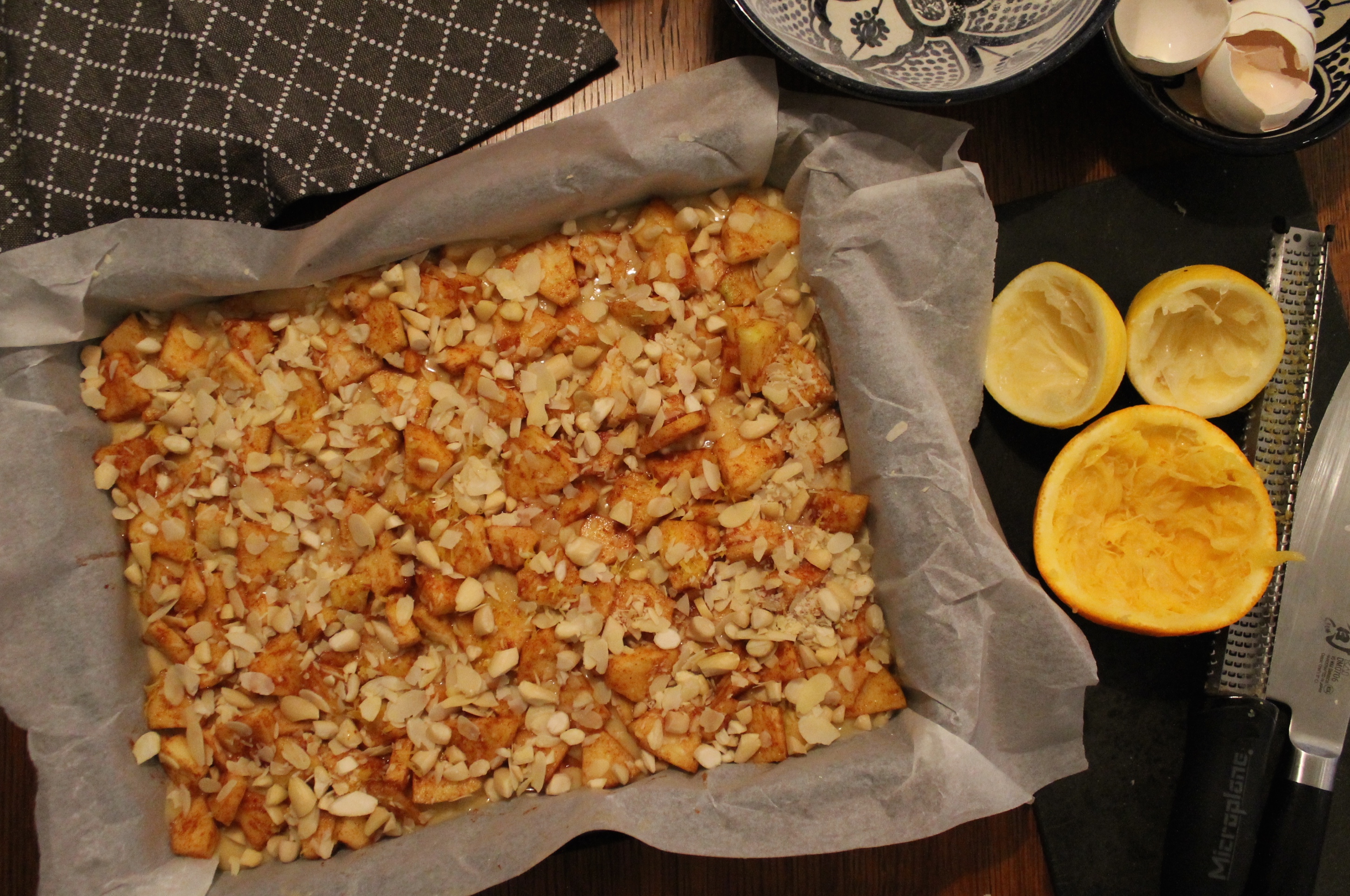 Heillið afganginum af deiginu yfir eplablönduna og dreifið vel úr því. Dreifi því sem eftir er af eplunum yfir deigið og stráið möndum og sítrónuberki jafnt yfir.