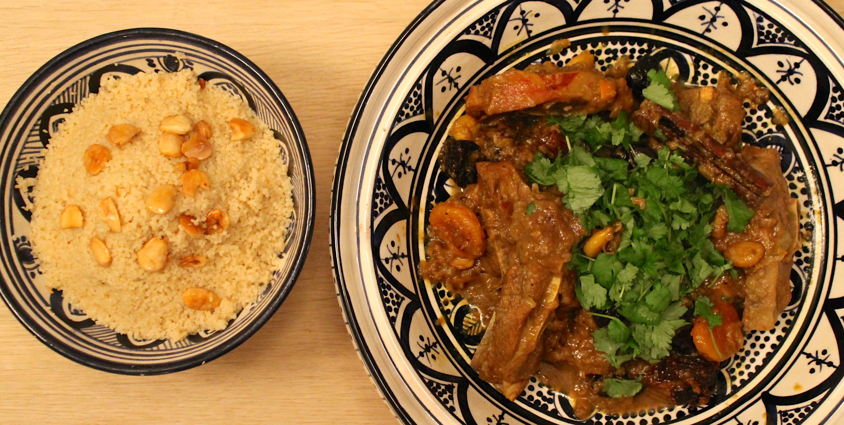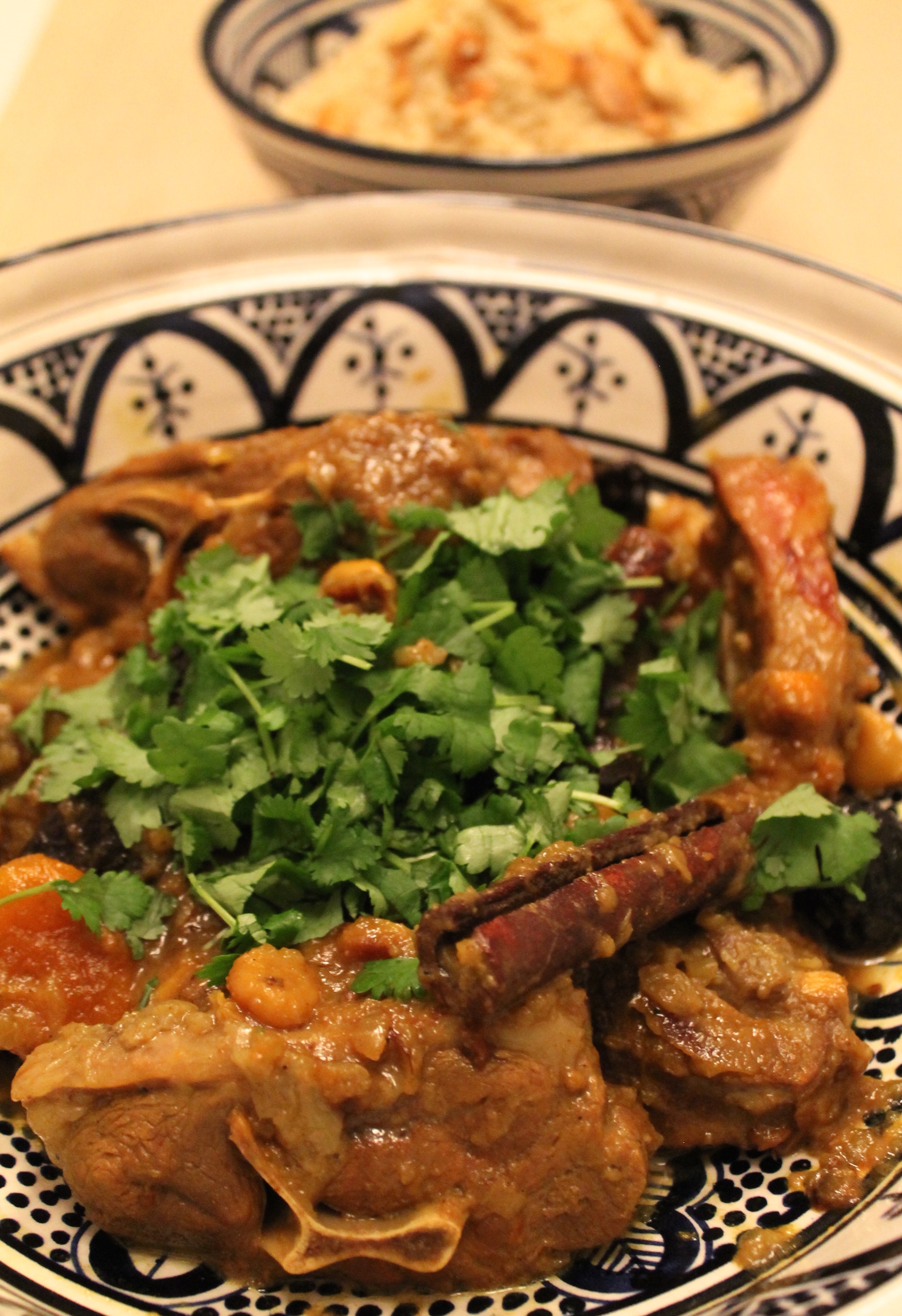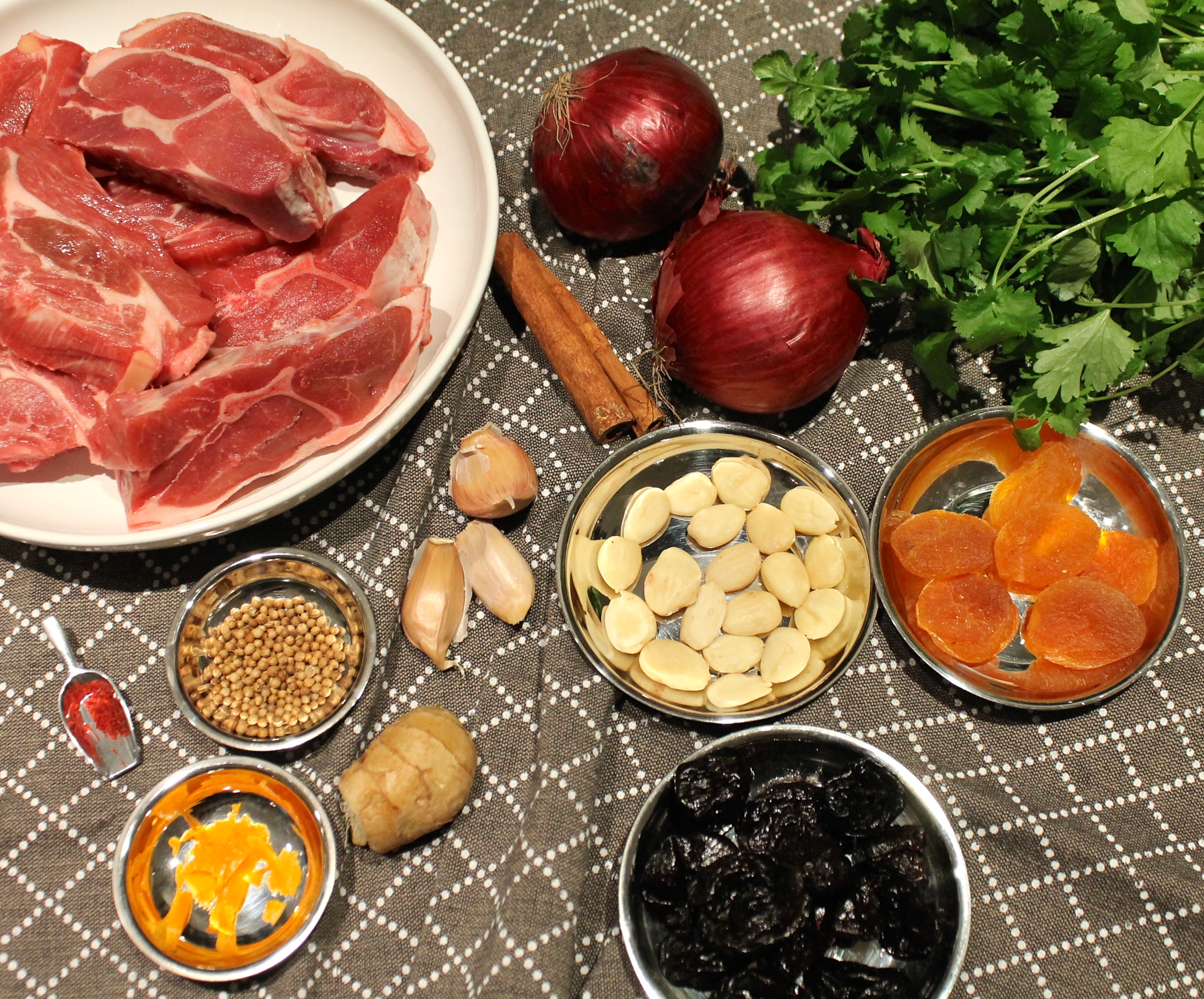 Hægeldað lambakjöt á vel við um helgar – þegar maður hefur betri tíma til að fást við matargerðina. Þessi réttur er einn þekktasti lambakjötsréttur Marokkó – bragðmikill en mildur, ilmandi af kanil, engifer og kóríander, ákaflega ljúfengur, svolítið sætur og safaríkur. Þurrkuðu ávextirnir, appelsínubörkurinn og hunangið í bland við milt en bragðmikið kryddið ljá þessum rétt einhverja galdra – dásemdar matargaldra. Í Marokkó er rétturinn yfirleitt borinn fram með marokkóskum brauðhleif og brauðið notað til að ná upp ljúffengri sósunni og hreinsa diskana eða ílátin sem rétturinn er borinn fram í. Það má líka bera réttinn fram með hefðbundnu cous cous eins og við gerum hér.