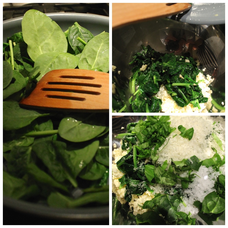 Hitið u.þ.b. 1 msk. af olíu á pönnu og steikið spínatið. Pressið hvítlaukinn og blandið saman við spínatið.