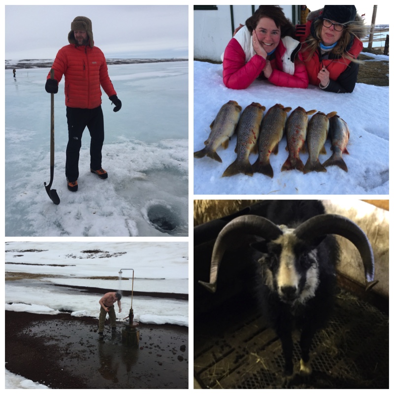 Um síðustu helgi lögðum við land undir fót með góðum vinum og fórum norður – fyrst til Akureyrar og þaðan í Reykjadalinn og Mývatnssveit. Við fórum á skíði, vitjuðum neta og drógum spriklandi ferskan silung í gegnum vakir á ísilögðu Másvatni, böðuðum okkur í funheitri gjá, gengum í drullusvaðinu í Bjarnarflagi, skoðuðum geitur og forystufé, borðuðum í fjósi á meðan mjaltir stóðu yfir, elduðum góðan mat og borðuðum jafnvel enn betri mat. Heim komum við endurnærð með fullt af skemmtilegum minningum í farteskinu – og spriklandi ferskan silung úr Másvatni sem fékk fádæma góðar viðtökur hjá Vatnsholtsgenginu í kvöld.