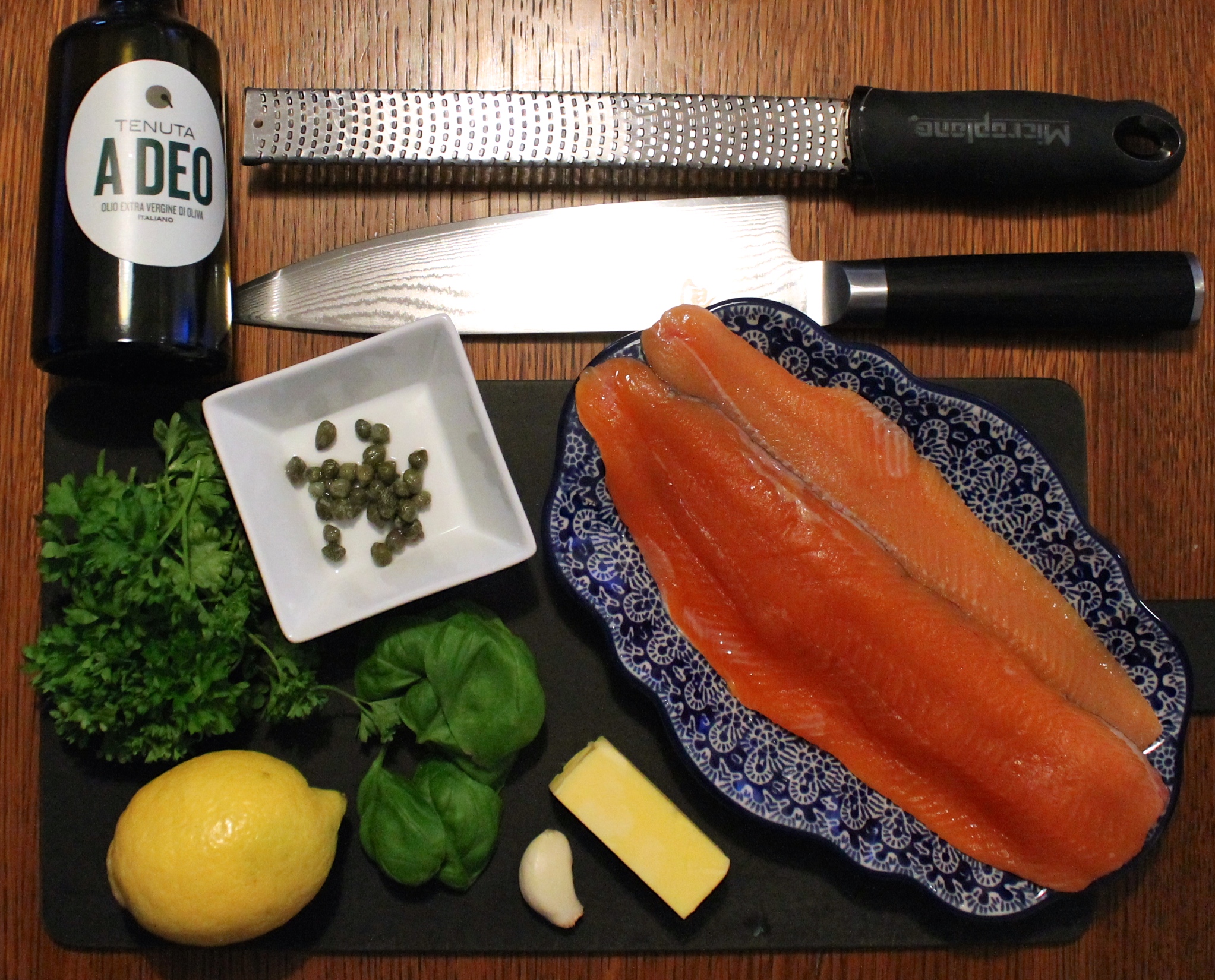 Merjið hvítlauksgeirann undir hnífsblaði og saxið smátt. Saxið kapersið, steinseljuna og basilikuna smátt. Rífið ysta lagið af sítrónunni og blandið saman við smátt saxað kryddið. Setjið allt í skál, kreistið safann úr hálfri sítrónu yfir, bætið olífuolíunni saman við og hrærið vel saman.