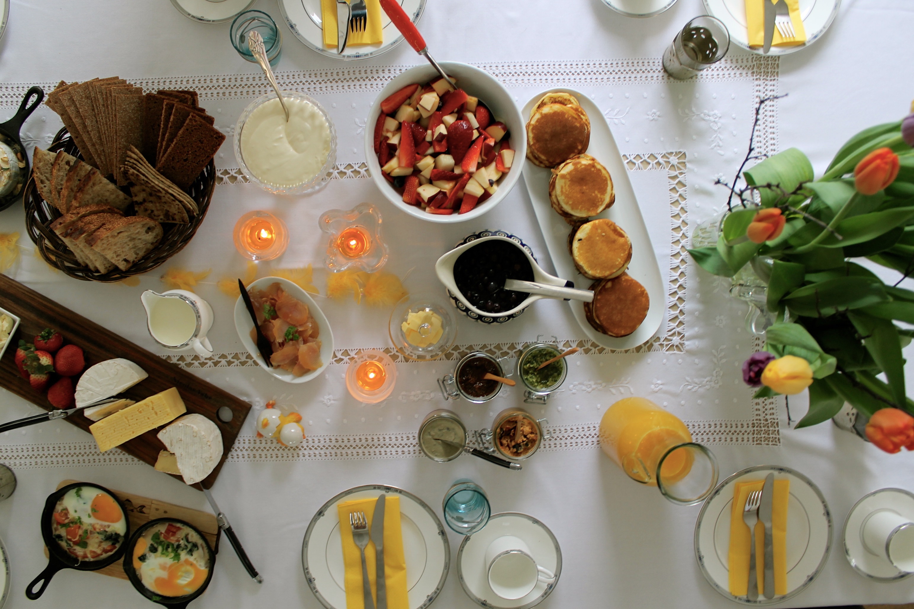 Síðbúin árdegisverðarboð er ákaflega vinsæl hjá Vatnholtsgenginu og um páskana hefur ekki verið slakað neitt á í þeim efnum – heldur þvert á móti 🙂 Það er fátt skemmtilegra en kalla saman gott fólk, njóta góðs matar, segja sögur, gera plön og hlægja svolítið. Það eru margar uppskriftir á þessari síðu sem henta vel á árdegisverðarhlaðborð. Á borðum okkar um páskana voru auk hráskinkubollana, gróft og gómsætt brauð, pestó með sólþurrkuðum tómötum, rjómaostur með sólþurrkuðum tómötum og ólífum, nokkrir góðir ostar og annað álegg ásamt dásemdar chili-berja-sulta, amerískum pönnukökum og fersku grænmeti og ávöxtum, að ógleymdu dásemdar kaffi og góðum ávaxtasafa. Hæfileg blanda af hollustu og sætindum. Það er vel hægt að gleyma sér lengi og njóta bæði samveru og matar í boðum sem þessum.