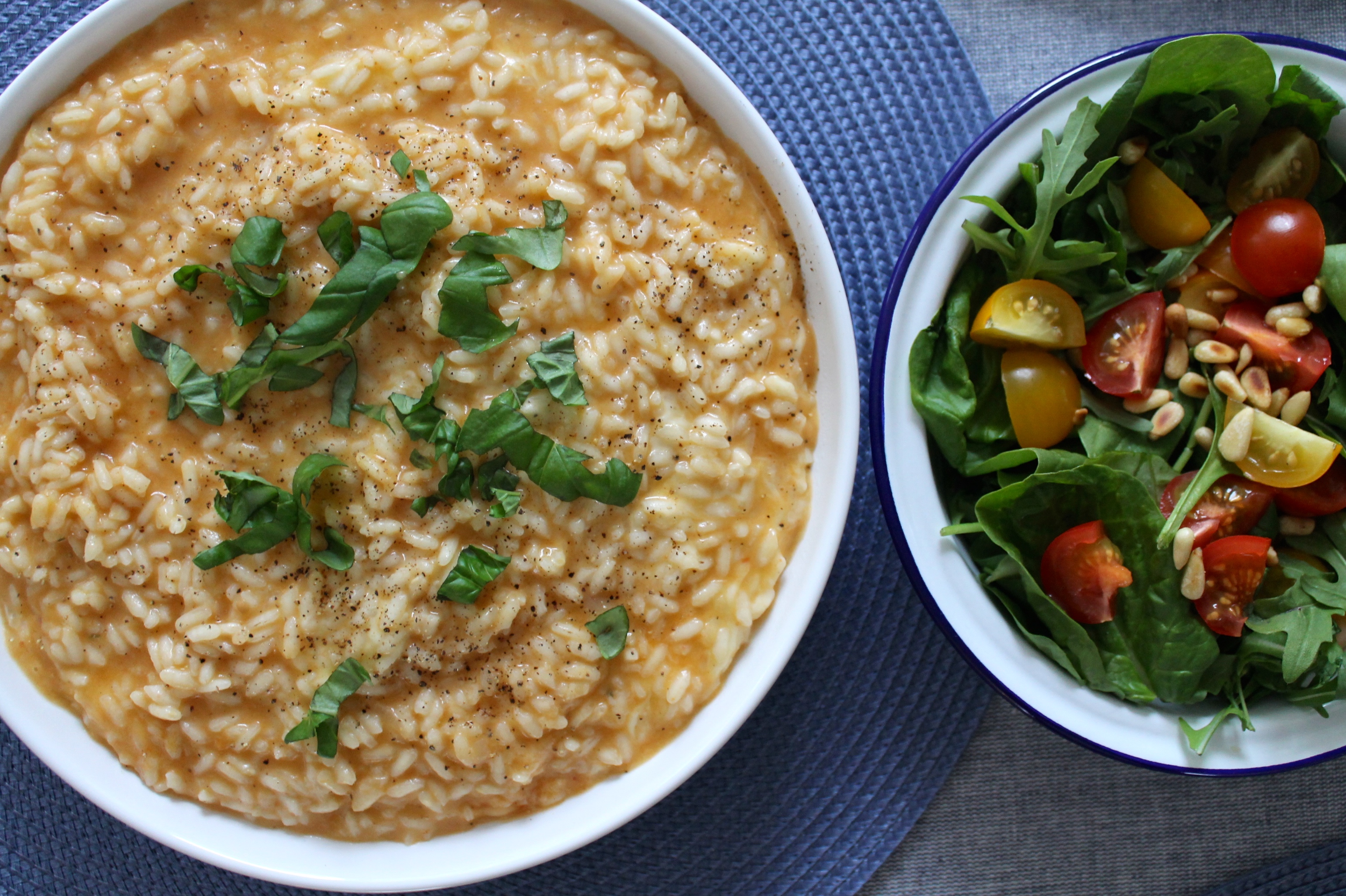 Við erum alls ekki hætt að borða kjöt þó það hafi farið minna fyrir slíkum uppskriftum hér að undanförnu, en við eldum mun oftar grænmetis- og fiskrétti en áður. Ein ástæða þess er að um áramótin setti fjölskyldan sér nokkur markmið eins og ég hef áður sagt frá. Eitt af markmiðum okkar í ár er að elda grænmetisrétt að lágmarki einu sinni í viku. Ég væri að segja ósatt ef ég héldi því fram að okkur hefði tekist 100% að fara eftir þessu – en markmiðið var ekki alveg að halda þessu 100% heldur meira svona tja…. 90% og það gerum við örugglega og vel það. Það er svo merkilegt að þegar maður setur sér markmið sem eru raunsæ, mælanlegt og tímasett þá verður svo miklu einfaldara að vinna að þeim. Þetta á bæði við um markmið sem snúa að einkalífi, námi og vinnu. Markmiðin þurfa ekkert endilega að vera mjög háleit og flókin, það er líka gaman að setja sér einföld markmið sem snúa að því að njóta lífsins í amstri dagsins – markmið sem miða að því að búa til ógleymanlegar stundir með fólkinu sem manni þykir vænst um. Jeminn eini nú er ég að verða væmin og komin langt frá þessum dásemdarrétti sem eldaður var í Vatnsholtinu í gærkvöldi – það hefur lengi staðið til að búa til nýjan Risotto rétt – hugmyndin af þessum er komin frá River Cottage – en ekki hvað, dvölin þar var meðal þeirra markmiða sem ég skrifaði niður á fyrsta degi þessa árs. Uppskriftirnar verða tvær í dag – önnur af tómatmaukinu dásamlega sem notað er í réttinn – hin af risotto-réttinum góða.