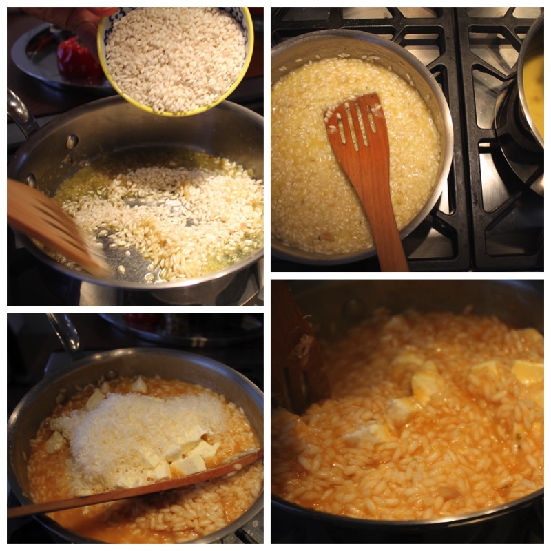 Leyfið grjónunum að hitna vel í gegn eða þar til þau verða nánast glær. Hellið þá hvítvíninu út á pönnuna og hrærið saman við grjónin. Hellið einni ausu af góðu grænmetissoðinu í senn út á grjónin í einu og hrærið vel. Grjónin eiga nánast að kalla á meira soð á milli þess sem þið ausið soðinu yfir þau. Þegar grjónin eru nánast soðin, það er eftir u.þ.b. 17 mín. bætið þá tómatmaukinu saman við og látið malla í nokkrar mínútur. Kryddið með salti og pipar. Bætið ostinum út í blandið vel saman – en ekki hræra of mikið, maður vill aðeins finna fyrir mozzarella-bitunum.