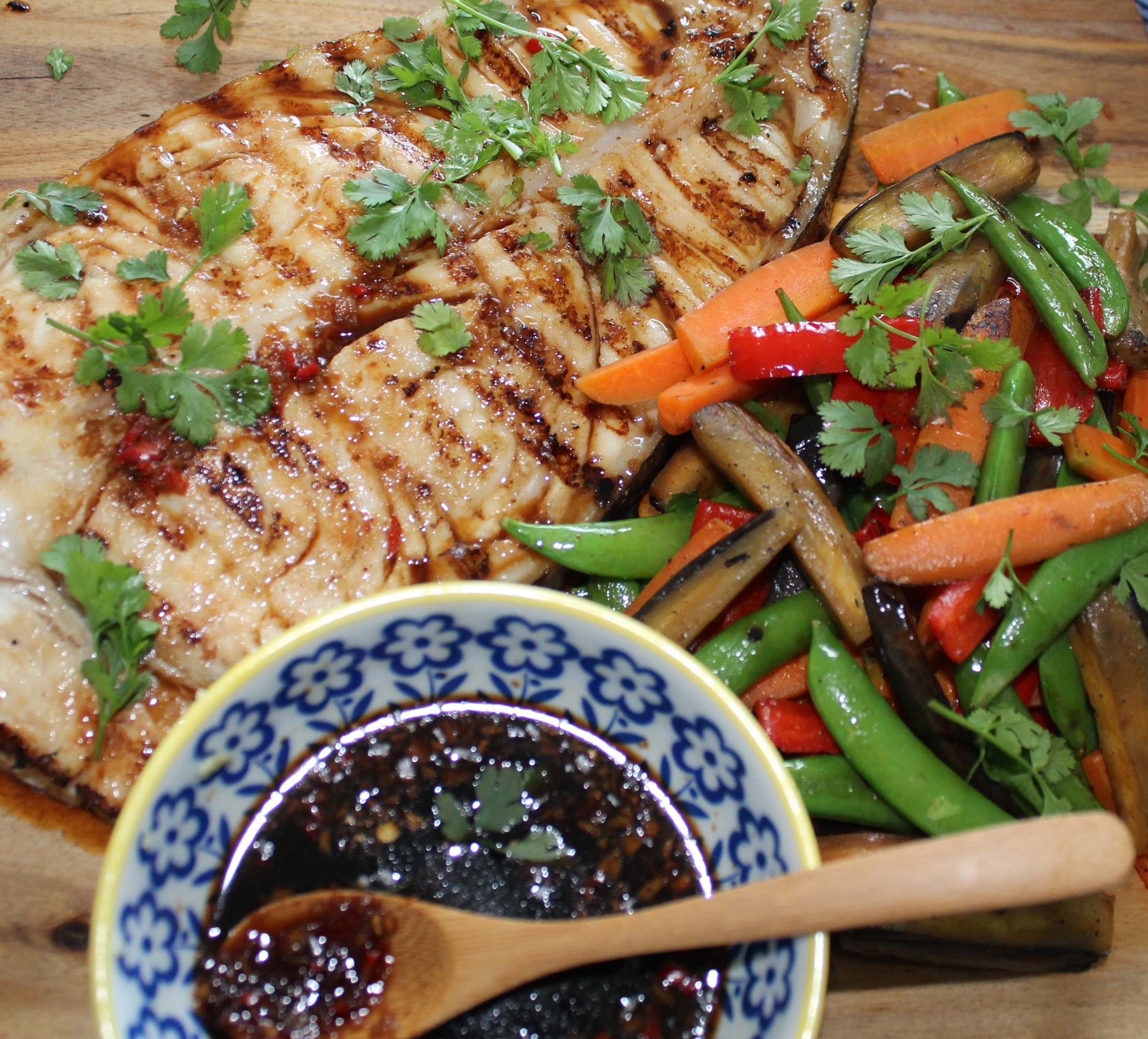 Blandið öllu sem á að fara í kryddlöginn saman. Penslið stórlúðusteikna með kryddleginum og grillið á heitu grilli í 3-5 mínútur á hvorri hlið. Penslið kryddleginum yfir þegar þið snúið henni við.