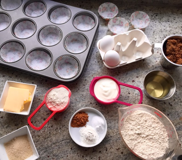 Hrærið þvi næst saman eggjum og sykri, bætið AB mjólkinni, olíu og vanilludropum saman við. Blandið loks þurrefnunum saman við, en gætið þess að hræra deigið ekki mikið eftir að þurrefnin eru komin saman við.