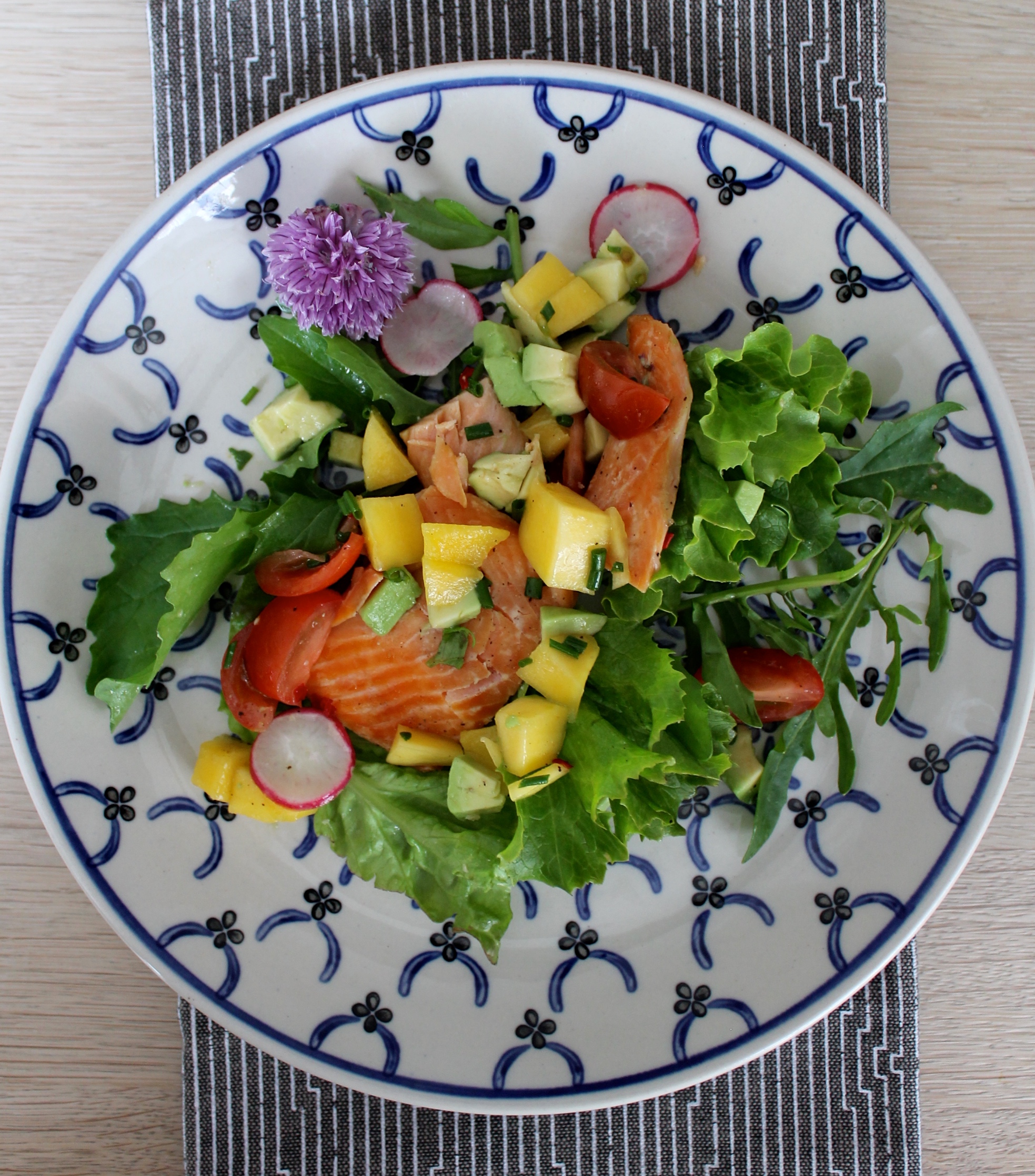 Blandið avakadó, mangó, tómötum, graslauk og chili saman, hellið olífuolíu og sítrónusafa yfir og blandið vel. Sejtið yfir salatið og fiskinn á fatinu. Raðið örþunnum sneiðum af radísum og nokkrum blómum af graslauk á fatið og malið svolitlu að góðum svötum pipar yfir. Borið fram eitt og sér eða með góðu brauði.