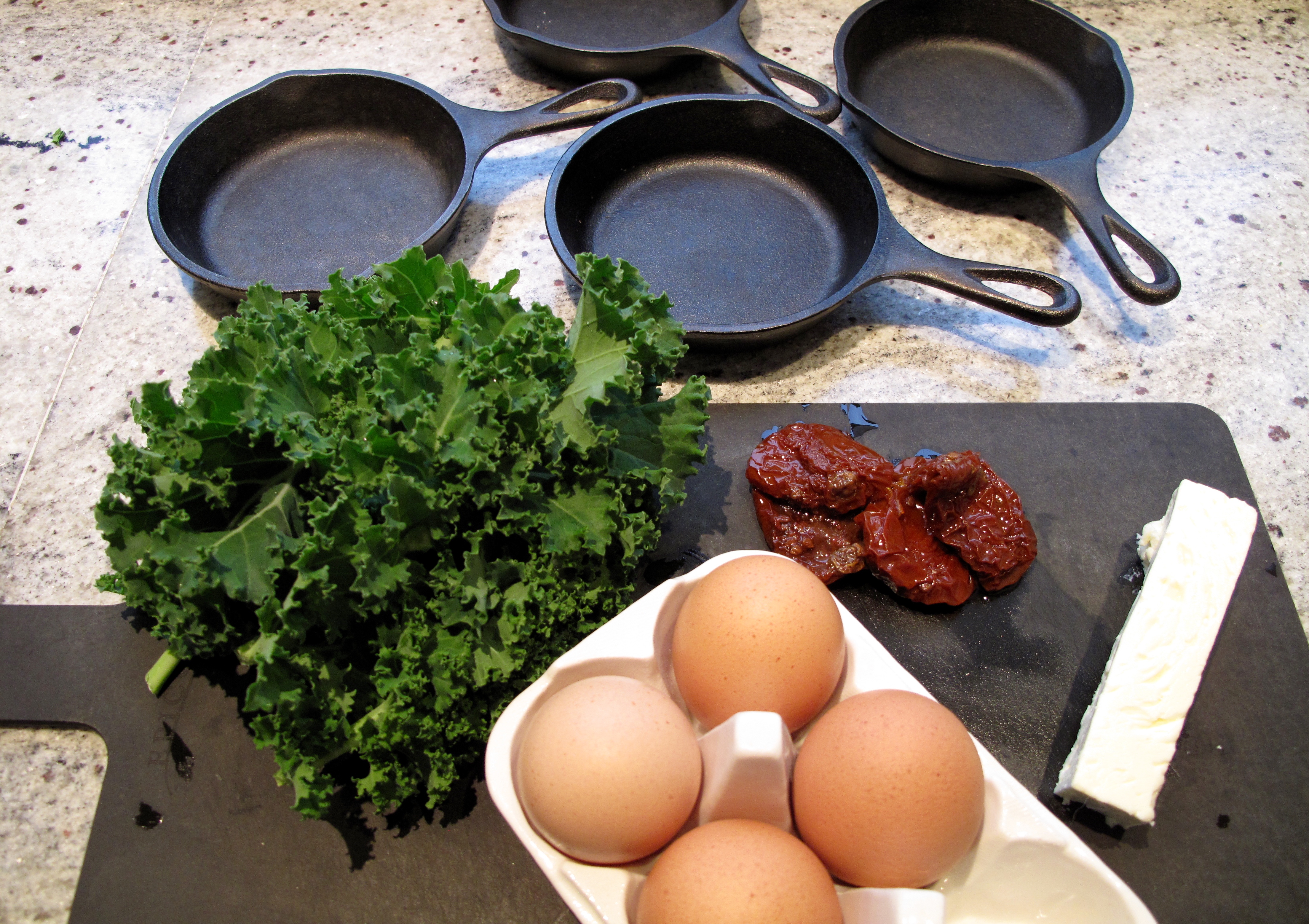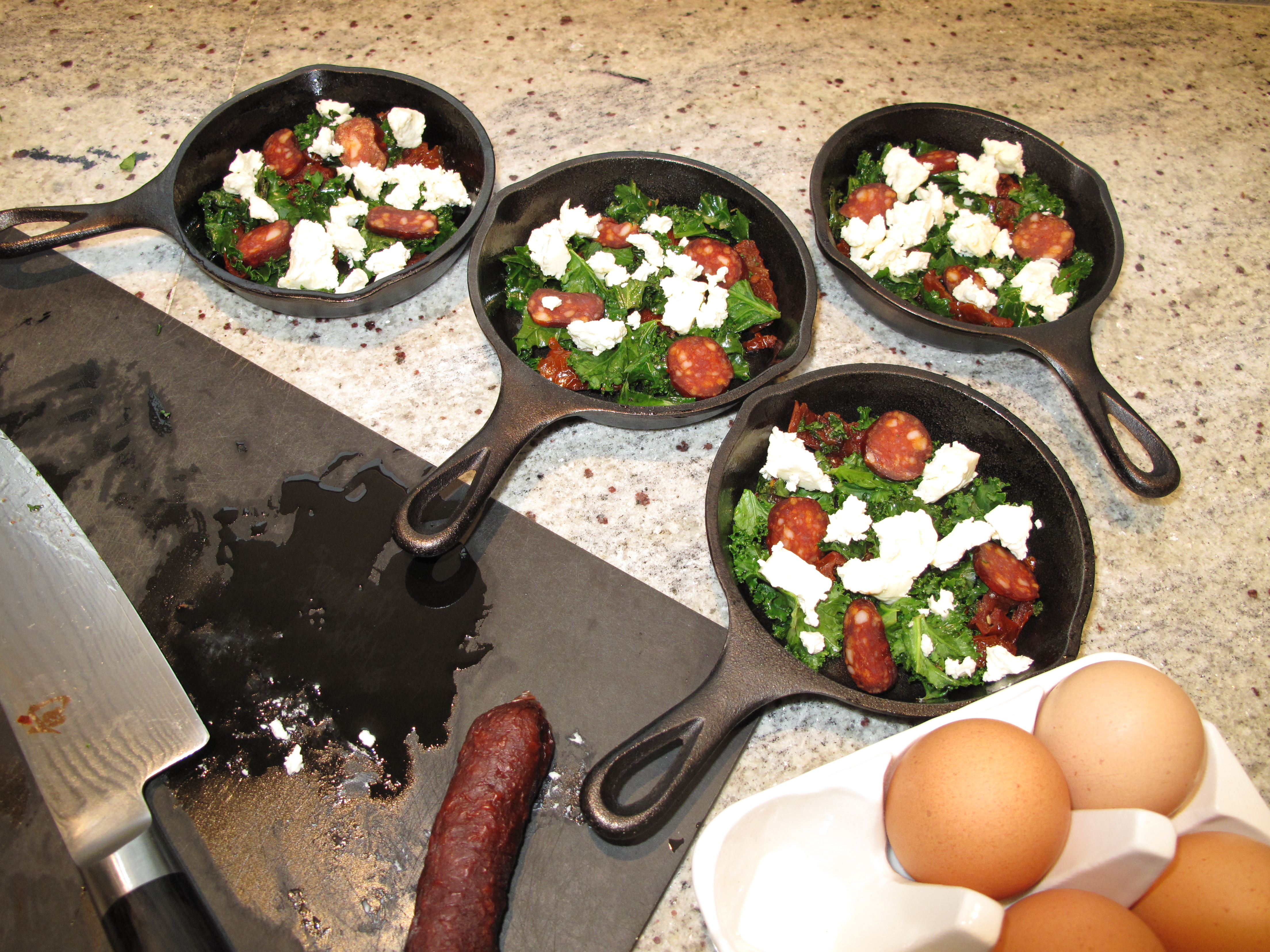 Fjarlægið stilkinn af grænkálinu og skerið kálið í grófa bita. Hitið olíuna á pönnu og steikið kálið í nokkrar mínútur þar til að mýkist. Skerið sólþurrkuðu tómatana í fremur smáa bita og bætið út á pönnuna. Í þetta sinn útbjó ég ommeletturnar í litlum Lodge pönnum og skipti því grænkáls- og tómatablöndunni jafnt á hverja pönnu – en þennan rétt má auðveldlega útbúa í einni stærri pönnu, þeirri sömu og þið notið til að steikja kálið á. Ég vel að útbúa omelltur í pönnu sem getur farið inn í ofn, þá þarf ég ekki að snúa þeim við á pönnunni. Raðið chorizio pylsunni ofan á grænkálsblönduna. Brjótið ostinn í grófa bita og dreifið yfir.