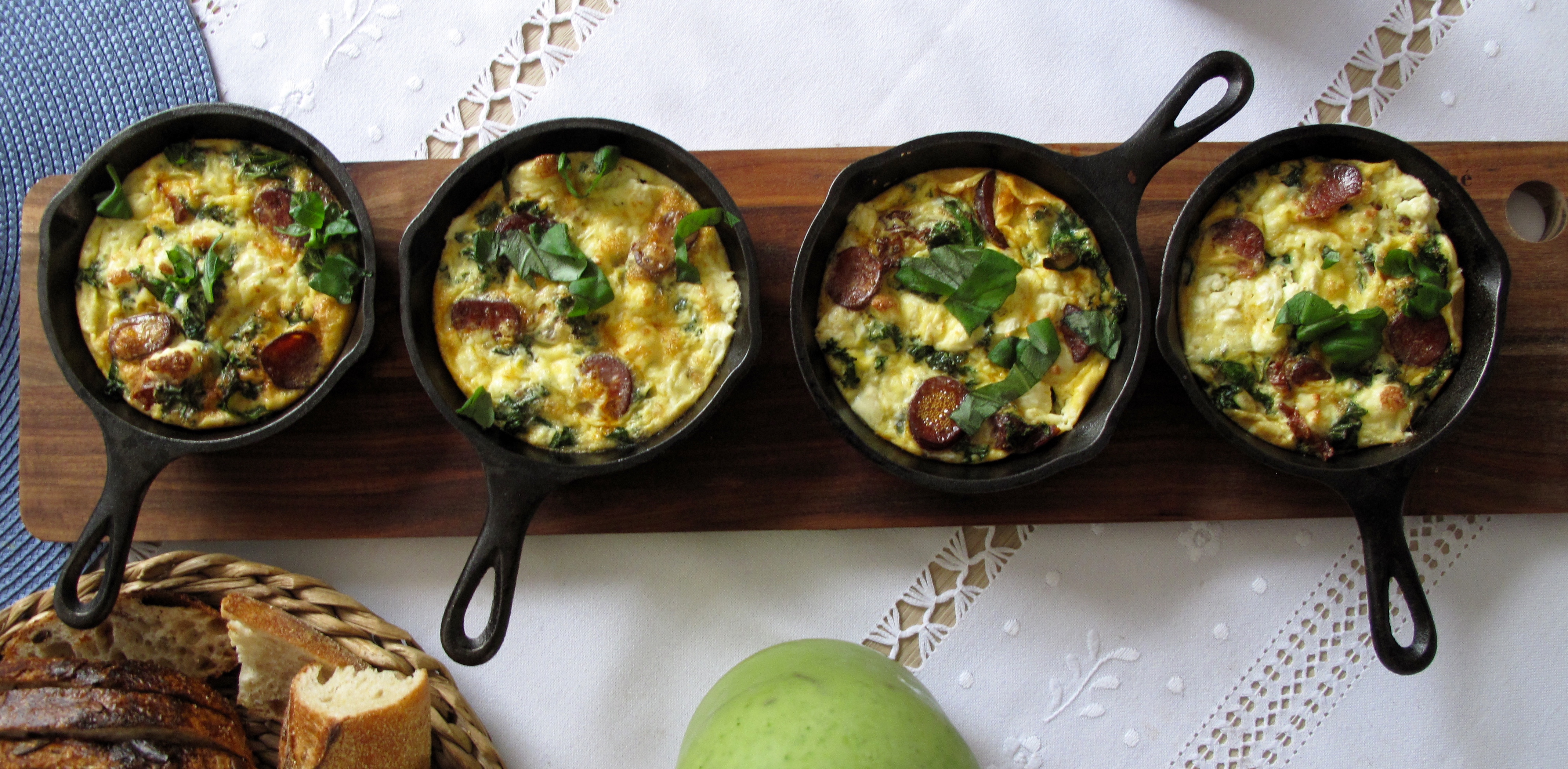 Það hefur verið lítið um nýjar færslur á vefnum að undanförnu – en það er svo sannarlega ekki til marks um að lítið sé um að vera í eldhúsinu mínu – þvert á móti bíða svo margar hugmyndir að færslum eftir úrvinnslu að ég veit vart hvar á að byrja 🙂 Til þess að koma mér í gírinn þá valdi ég að setja inn nýjasta réttin, einfaldan eggjarétt sem var á brunch borðinu þennan sunnudagsmorgun. Ég veit fátt dásamlegra en að fá skemmtilegt fólk í heimsókn, elda góðan mat, njóta og spjalla um heima og geima. Í dag komu ákaflega kærir vinir til okkar í árdegisverð (brunch) – við bökðum sítrónuvöfflur eftir þessari uppskrift, náðum í gott súrdeigsbrauð hjá Sandholti, settum gott álegg, grænmeti og osta á bakka týndum til sultur, chutney og pestó sem eru alltaf er til í ísskápnum – útbjuggum hressandi drykk úr appelsínum, grænkáli, engifer og fleira góðgæti – helltum upp á gott kaffi og sátum síðan og nutum í 3 klukkustundir – gæðastund sem seint verður ofmetin. En aftur að þessum einfalda rétti – ommelettu – eins og stundum þá er þetta meira aðferð en heilög uppskrift – um að gera að aðlaga að eigin smekk og því sem til er hverju sinni. Við eigum svo mikið af grænkáli í garðinum að það hentar vel að nota það – en spínat virkar örugglega jafnvel.