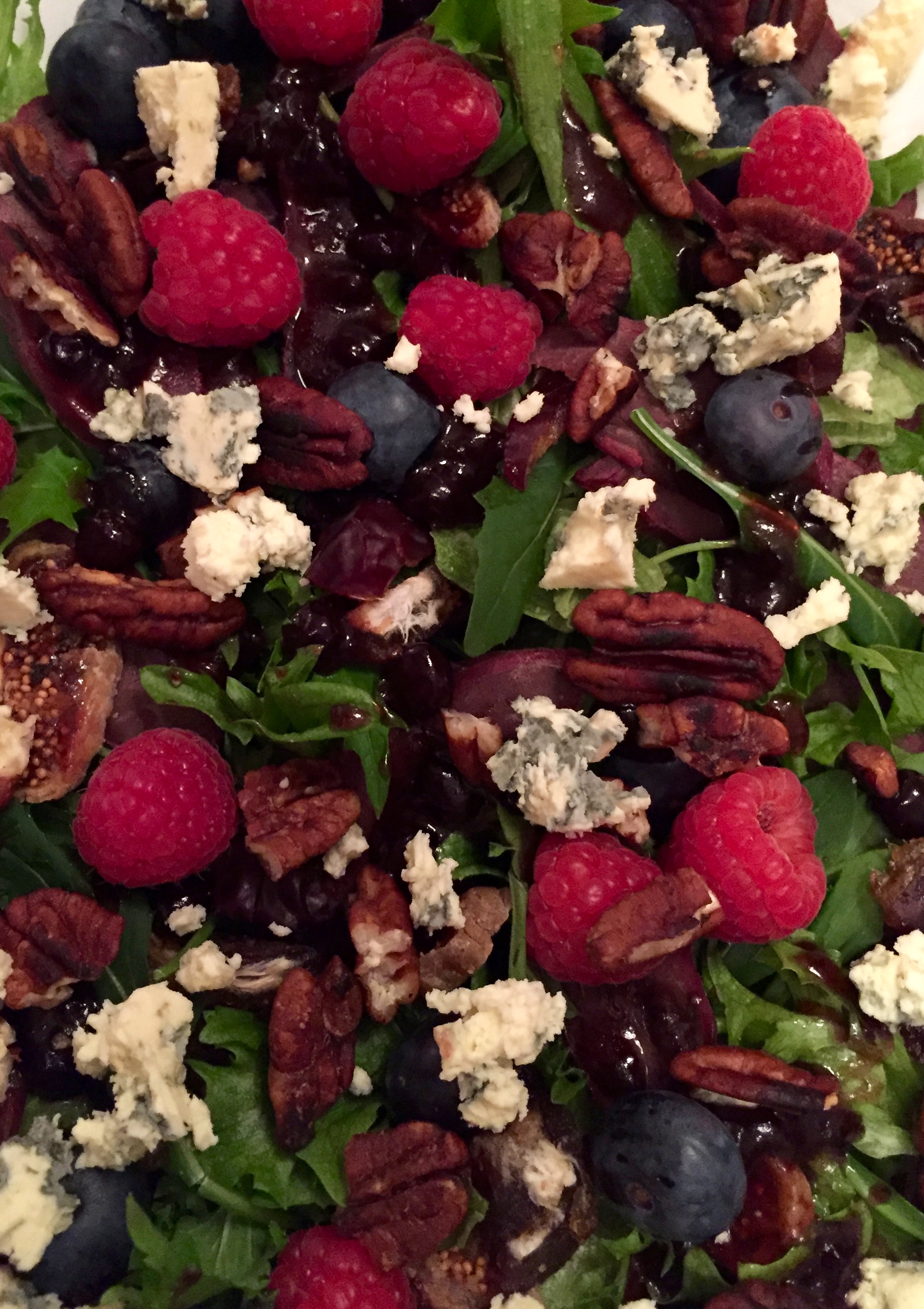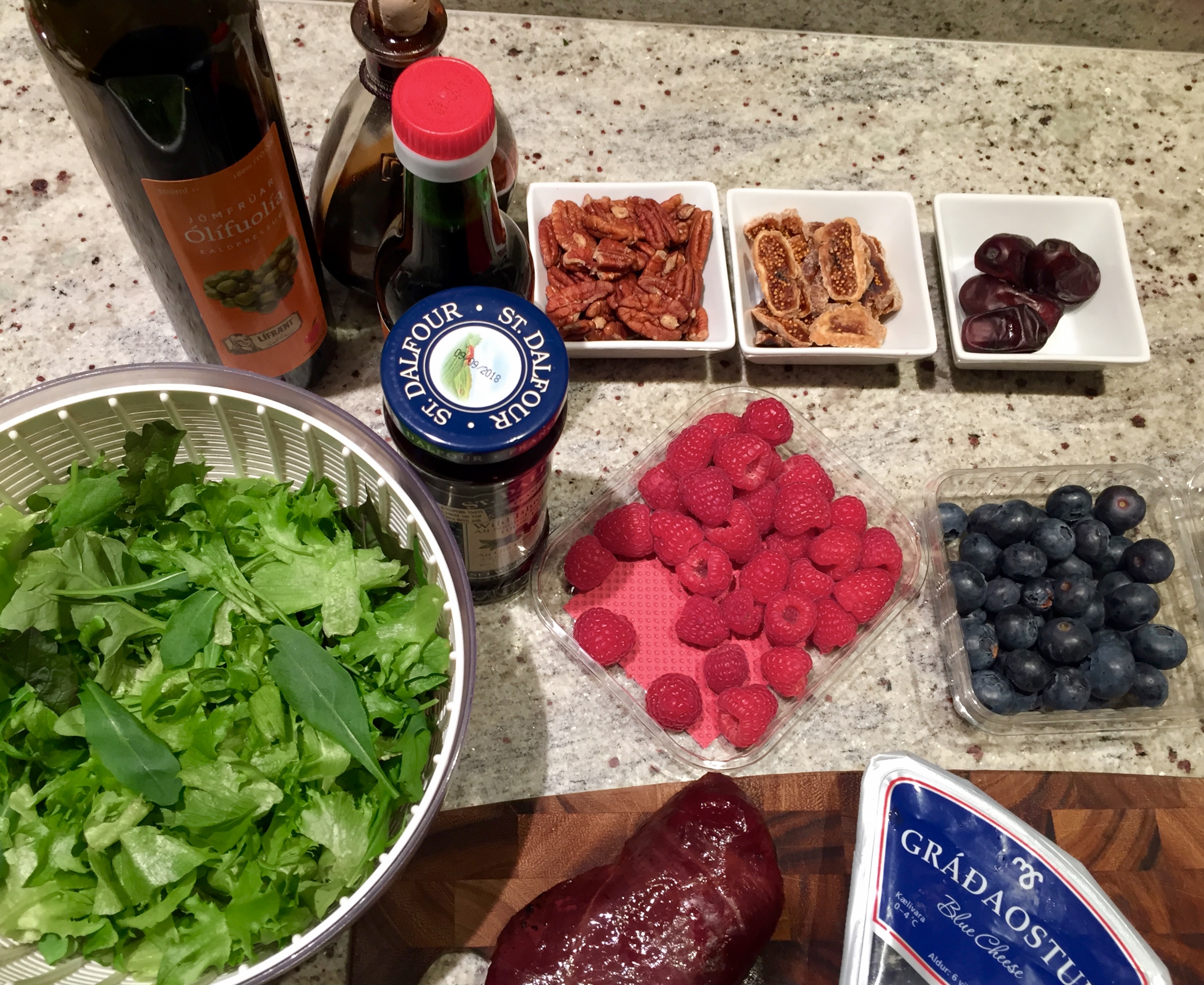 Raðið salatinu fallega á fat. Skerið gæsabringuna, gráfíkjur og döðlur í þunnar sneiðar og blandið fallega saman við salatið á fatinu. Raðið fersku berjunum yfir, myljið því næst gráðostinum yfir, stráið gróft söxuðum hnetunum yfir og dreypið loks bláberja-dressingunni yfir salatið – sjálf set ég um það bil helminginn yfir salatið, en ber hinn helminginn með í skál svo hver og einn bæti út á að eigin smekk.