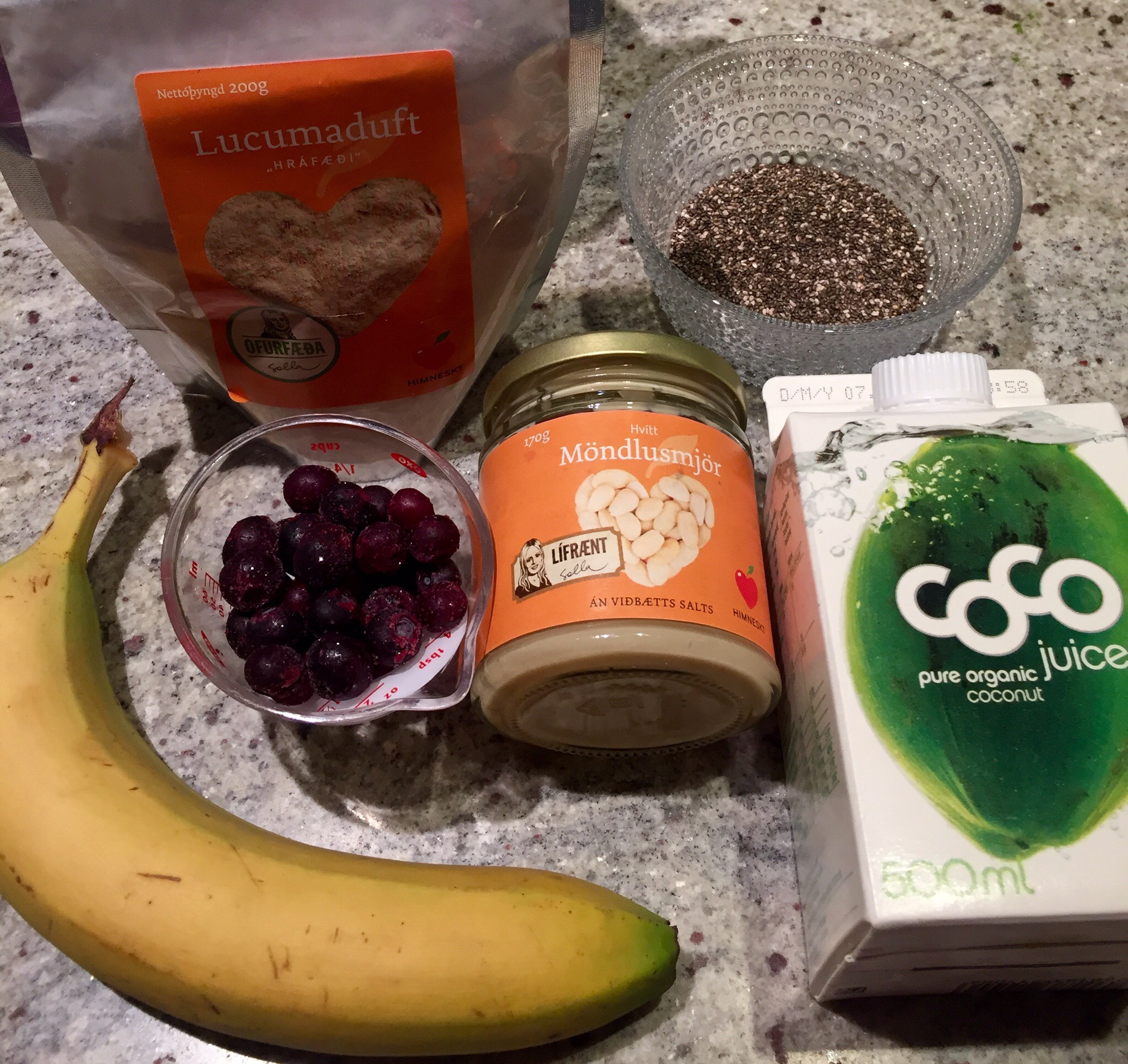 Setjið banana, frosin bláber, möndlusmjör, lucumaduft og kókosvatna í blandarann og þeytið vel.