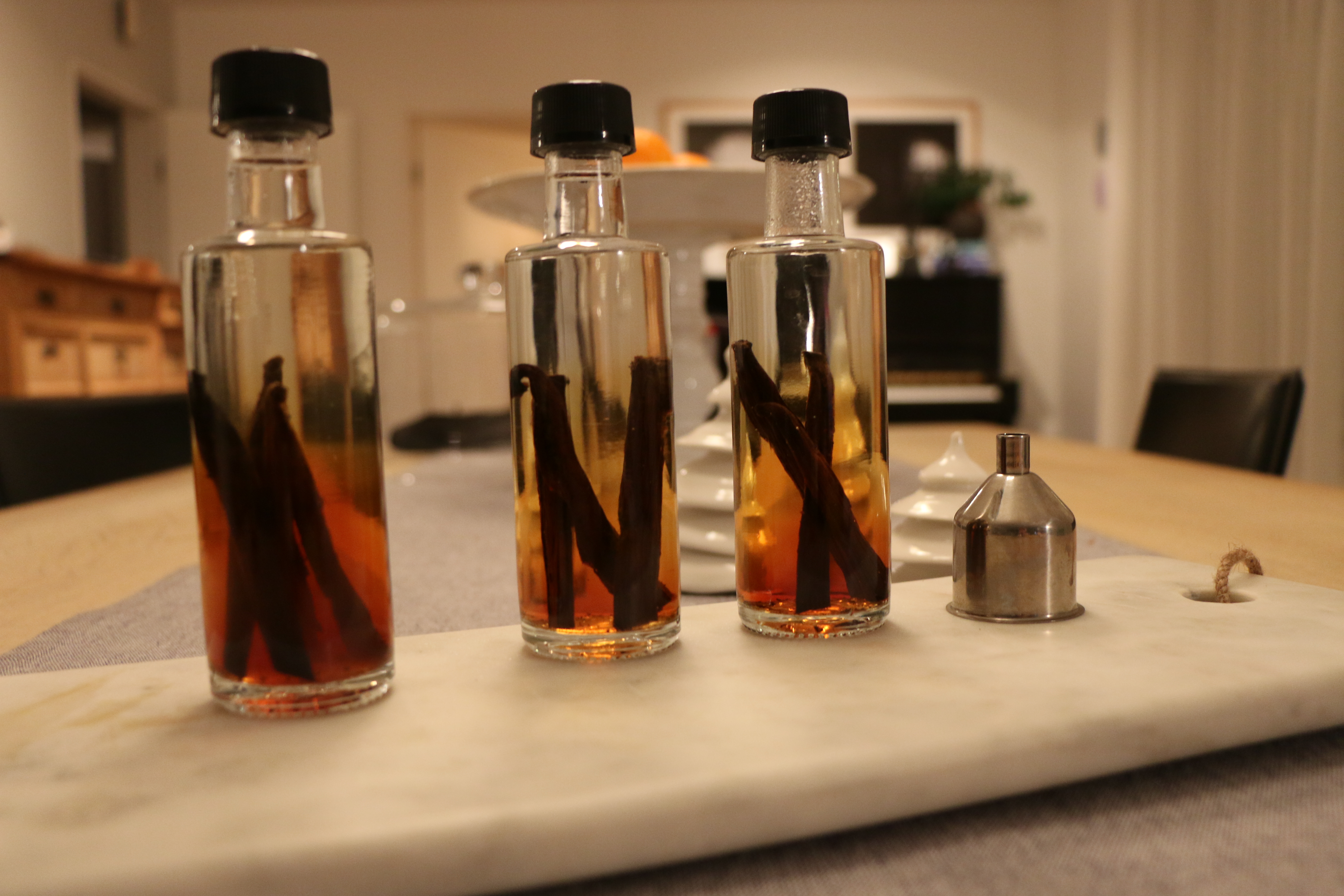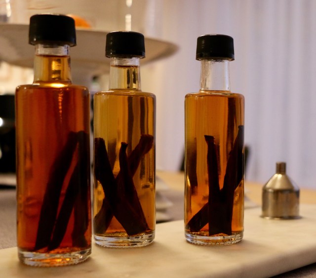 Fljótlega fer vanillan að lita vökvann og strax á 2. degi má sjá hvernig vökvinn tekur á sig gullinbrúnan lit. Smátt og smátt verður vökinn dekkri og eftir u.þ.b. 3 vikur er vanilludroparnir tilbúnir til notkunar. Sjálf fylli ég vodka reglulega á flöskuna án þess að taka upphaflegu stangirnar úr henni, bæti líka vanillu við þegar ég er t.d. að búa til jólaísinn og þarf bara vanillukornin út stönginni – þá sting ég henni út í flöskuna og á þannig alltaf góða vellyktandi vanilludropa – þá bestu sem ég hef nokkurn tíma átt.