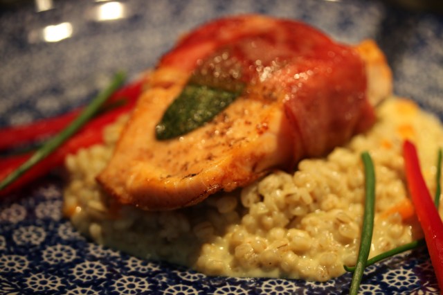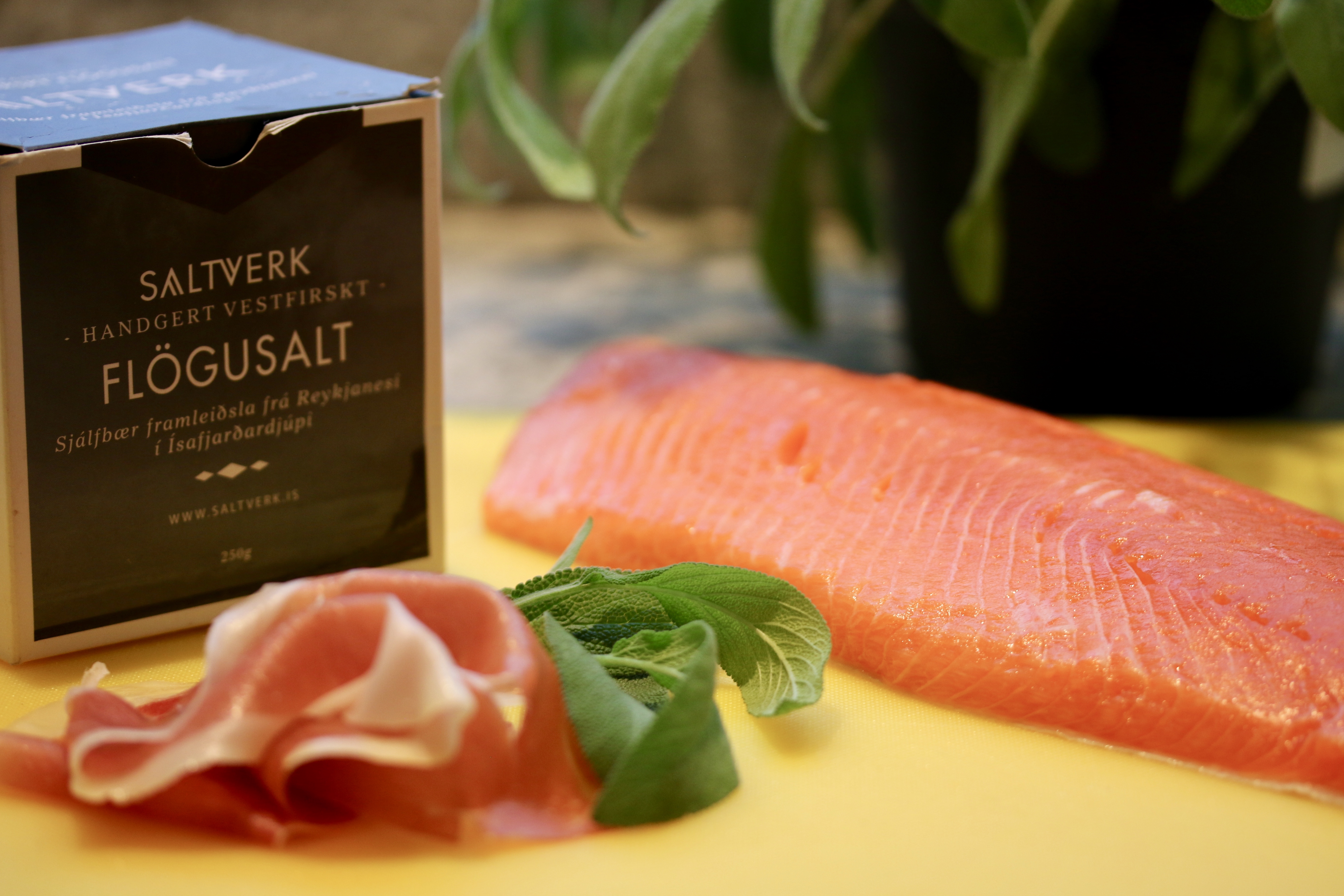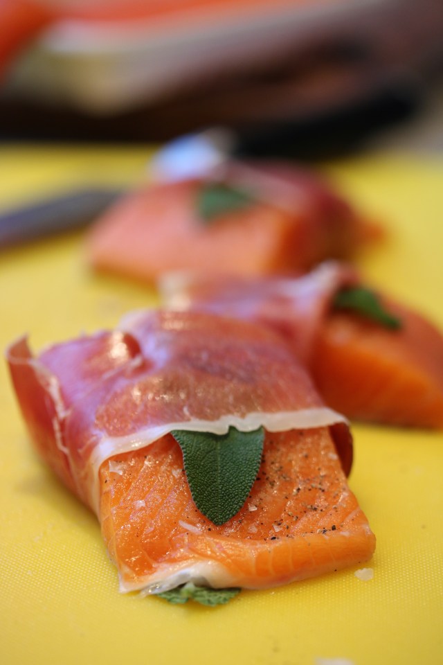 Setjið tvo salvíublöð og hvern bita og vefjið hráskinkusneið utan um.