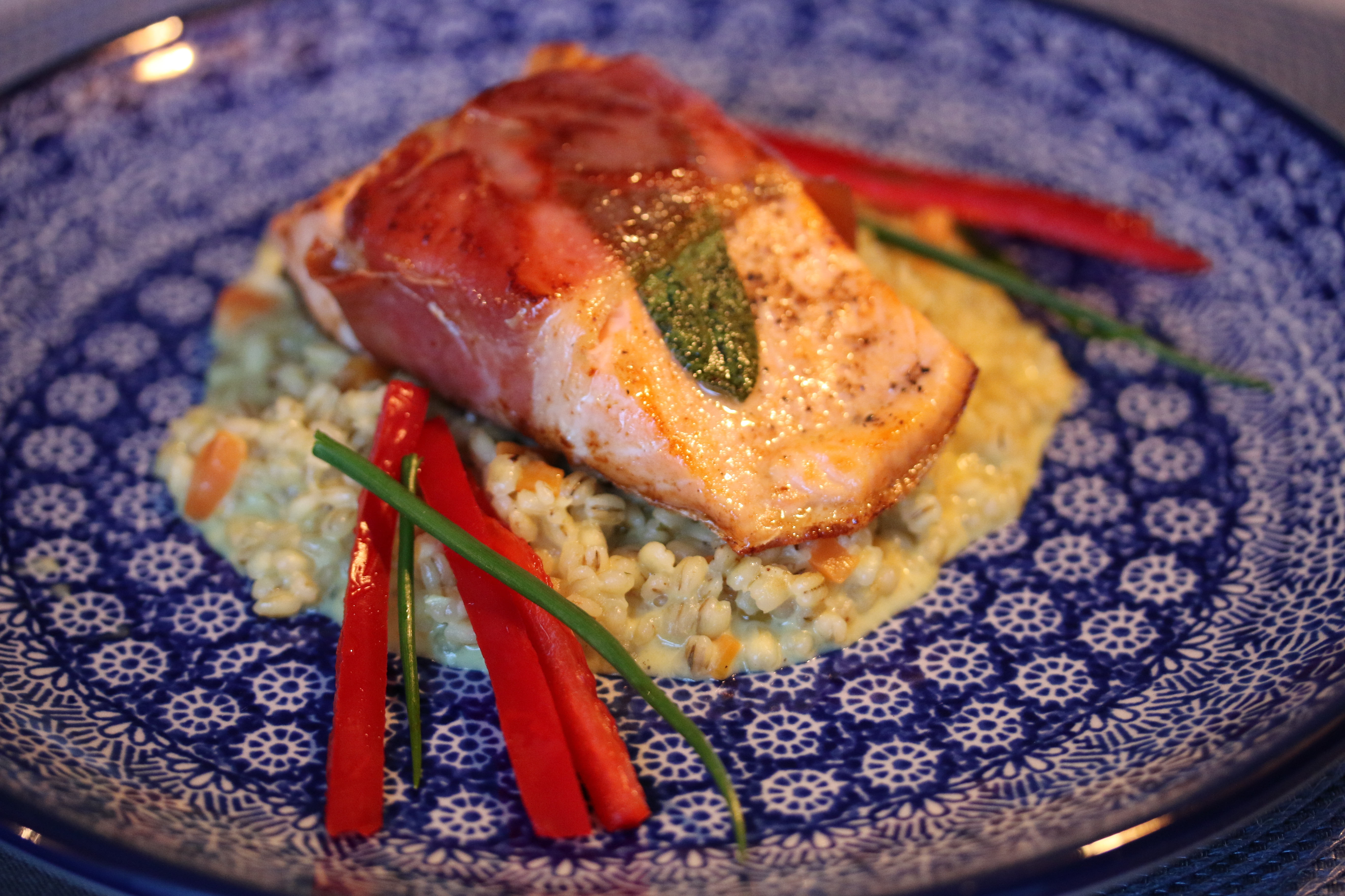 Gott er að byrja á byggottóinu á þessu stigi – geyma fiskinn innpakkaðan á meðan og steikja hann svo um það leyti sem byggið er um það bil tilbúið.