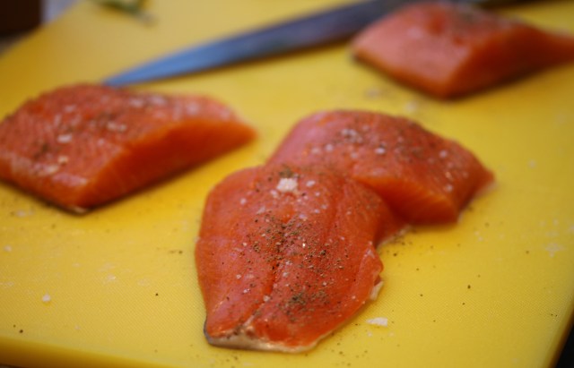 Skerið fiskinn í 4 góða bita, kryddið með salti og pipar.