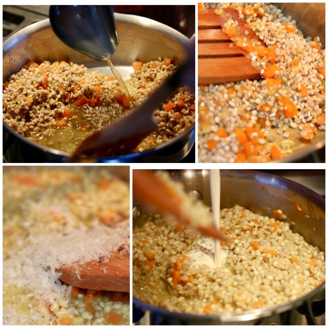 Bræðið smjör í potti og steikið lauk og gulrætur við lágan hita í 5-7 mínútur. Hækkið hitann, bætið hvítlauk í pottinn og síðan perlubygginu og steikið í 1-2 mínútur eða þar til byggið hefur dregið svo til alla fituna í sig. Hellið hvítvíni út í pottinn og hrærið saman þar til vínið er að mestu gufað upp. Bætið heitu grænmetissoðinu út í pottinn smátt og smátt, einni ausu í senn og látið byggið draga í sig vökvann áður en næsta ausa er sett í pottinn, það tekur um það bil 20 mínútur að elda byggið og þarf að standa yfir pottinum allan tímann. Að lokum er rifnum parmesan osti, rifnum berki og safa úr ½ sítrónu ásamt rjóma hrært út í, slökkvið undir pottinum, setjið þétt lok á og leyfið bygginu að hvíla í nokkrar mínútur áður en þið berið réttinn fram.